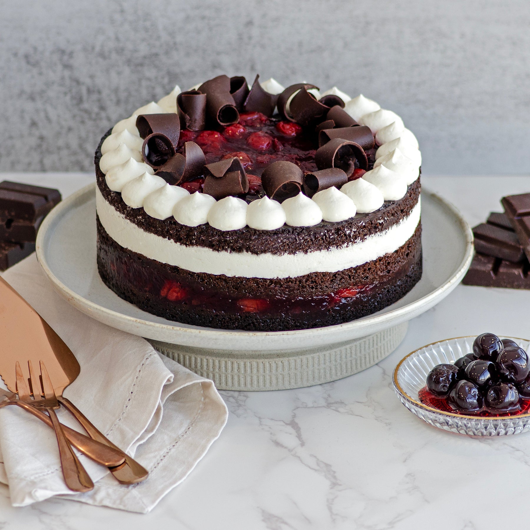 Indulge in three layers of decadent chocolate cake soaked in a classic kirsch-infused