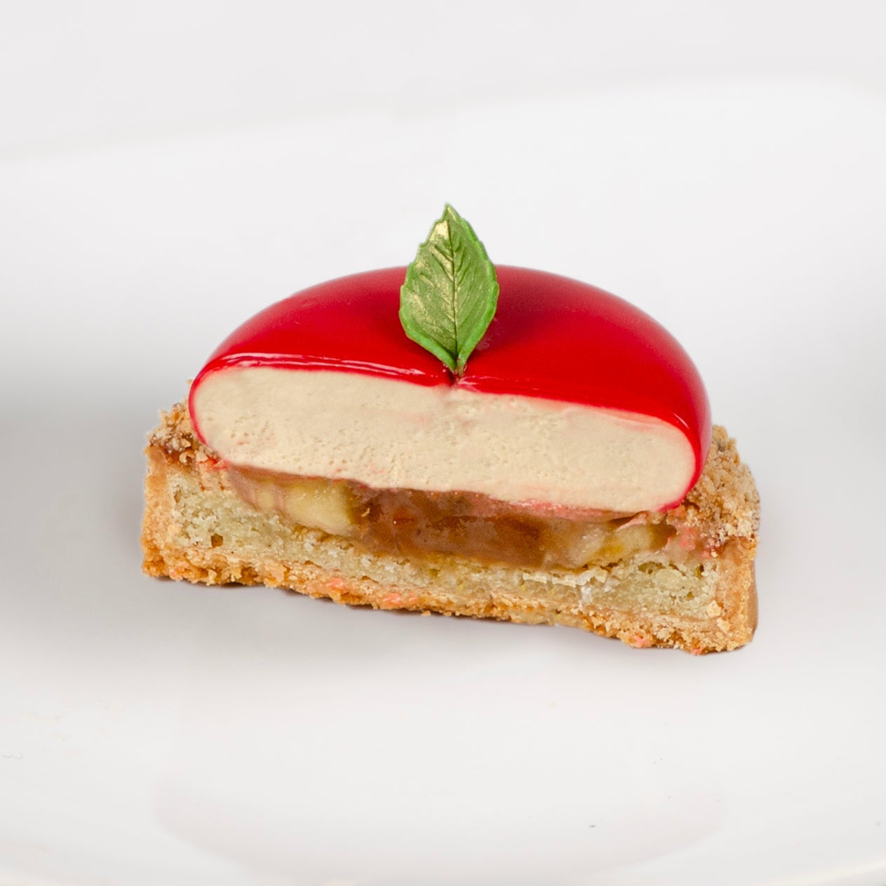 Our version of an apple tart.  A buttery tart shell filled with almond cream, house made caramel apple butter and cooked local apples. Topped with a caramel mousse covered in a shiny glaze and finished with oat crumble.