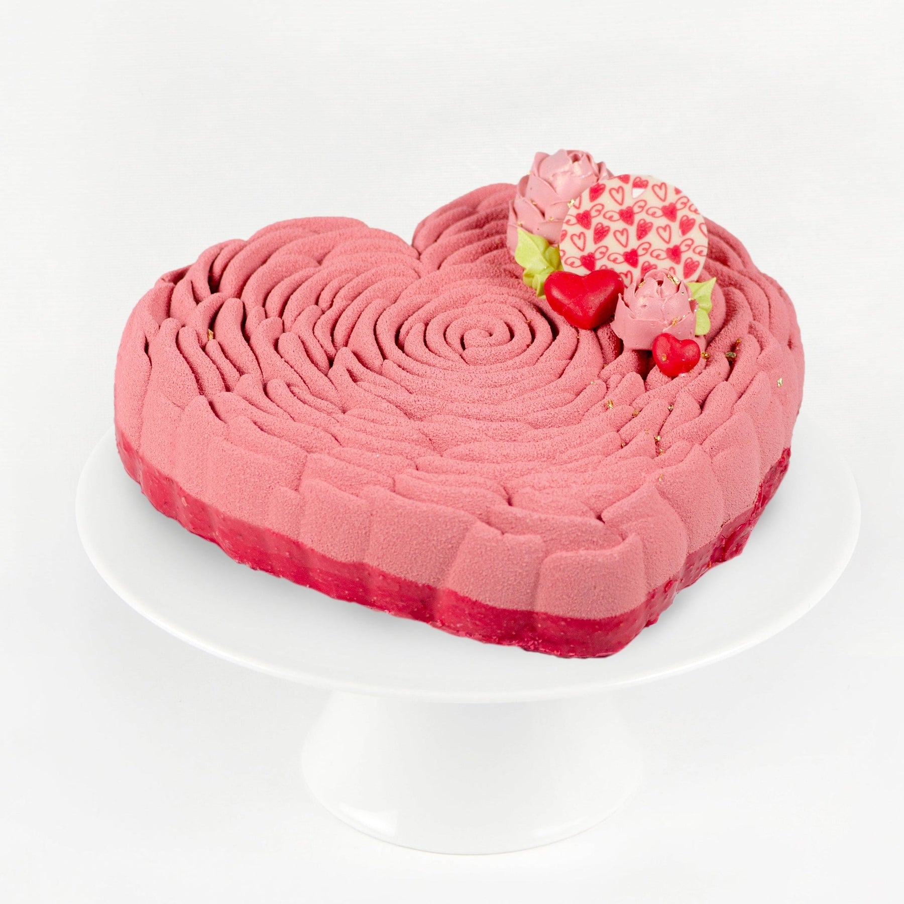 Share with you loved ones! Layers of 70% dark chocolate mousse, salted caramel, vanilla bean caramel cream, sit on a chocolate almond macaron. Sprayed with pink coloured chocolate for a velvet finish. Gluten free.