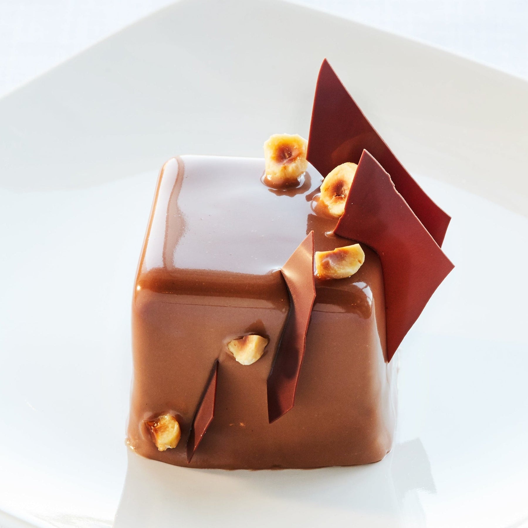 Smooth chocolate and hazelnut mousse, flourless chocolate cake, caramelized hazelnut praline. Finished with chocolate glaze and and chocolate shavings. Gluten free.